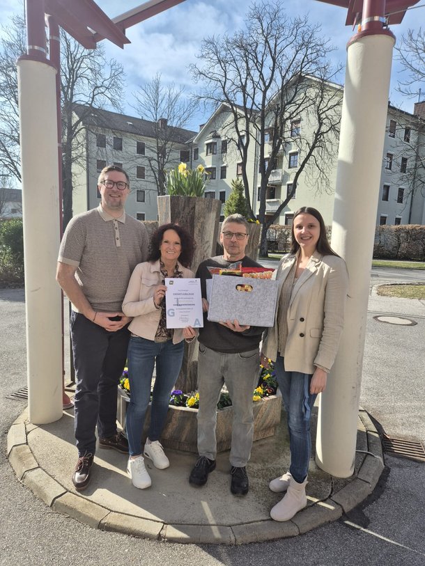 Haustechniker Gerhard Heinschink feierte sein 25-jähriges Dienstjubiläum im NÖ Landesdienst. Zu diesem besonderen Anlass gratulierten der kaufmännische Direktor Johannes Salaban-Hofer, die Pflegedirektorin Eva Grabbe sowie die Bereichsleitung Management Wirtschaft und Support Patricia Iorga, herzlich und bedankten sich für seinen langjährigen Einsatz und seine verlässliche Arbeit im Pflege- und Betreuungszentrum Pottendorf.